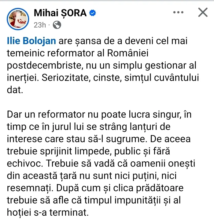 Și pe pagina de Facebook a filosofului Mihai Șora, decedat în urmă cu trei ani, a fost postat un mesaj PRO Bolojan. Printre altele, „Șora” a subliniat că îl consideră pe premier un posibil mare reformator al României postdecembriste. În postare se menționează că Bolojan are calități precum seriozitatea și integritatea, dar că nu poate reuși singur, dacă este blocat de rețele de interese.